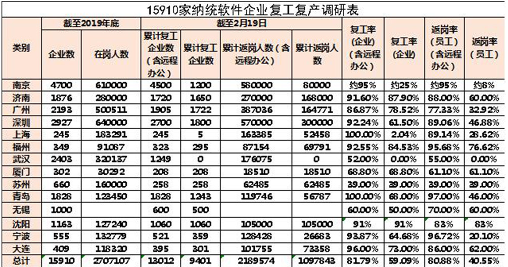 據中國電子信息產業發展研究院賽迪智庫信息化與軟件產業研究所監測,截至2月19日,南京、濟南、廣州、深圳、上海5個綜合型中國軟件名城,福州、武漢、廈門、蘇州、青島5個特色型中國軟件名城,無錫、沈陽、寧波、大連4個創建試點城市,納統企業共計15910家,復工13012家,復工率81.79%,累計返崗(含遠程辦公)2189574人,返崗率達80.88%,到崗1097843人,到崗率達40.55%;其中42家軟件百強企業已全部復工,累計返崗(含遠程辦公)356218人,返崗率達83.85%,到崗261364人,到崗率達61.51%;國家規劃布局內重點軟件企業231家,復工227家,復工率98.27%,累計返崗(含遠程辦公)473702人,返崗率達89.04%,到崗270156人,到崗率達50.78%。