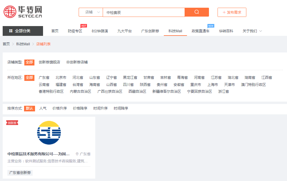 企業/創業者在“華轉網”-科技Mall-輸入“賽辰”或“中檢賽辰”搜索到中檢賽辰店鋪。