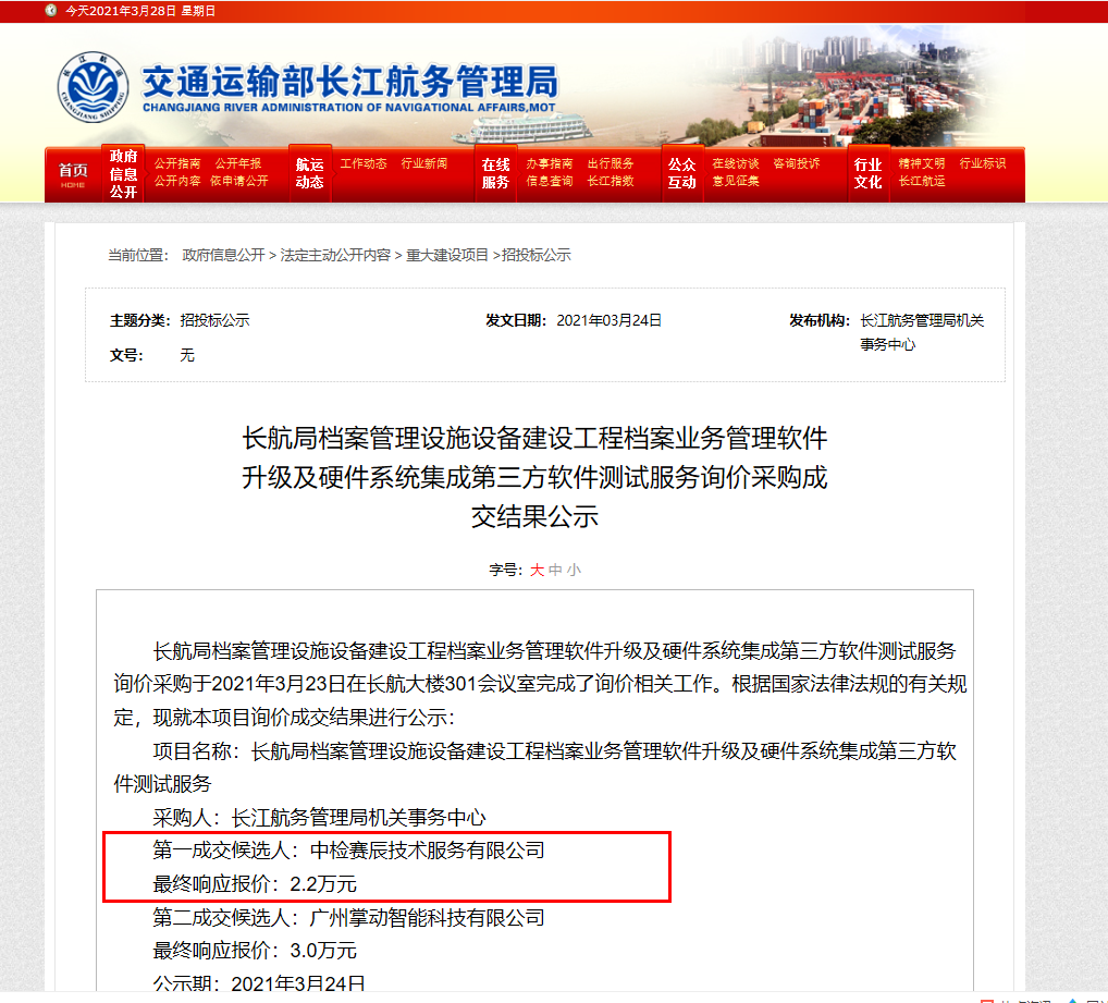 祝賀中檢賽辰技術服務有限公司(簡稱:賽辰)中標長航局檔案管理設施設備建設工程檔案業務管理軟件升級及硬件系統集成第三方軟件測試服務。